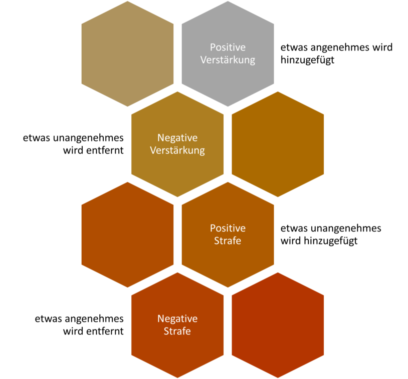 Lernen funktioniert über vier grundsätzliche Hauptachsen. Entscheidend für die Nachhaltigkeit des Trainingserfolges und auch das Training selbst ist, welche der vier Hauptachsen wir für unser Handeln auswählen. Positive Verstärkung hat zum Ziel eine korrekte Reaktion des trainierten Tieres durch einen positiven Stimulus zu belohnen. Diese Hauptachse wirkt über die Freude des Tieres, für eine bestimmte Handlung eine positive Konsequenz zu erwarten. Negative Verstärkung zielt darauf ab, einen unangenehmen Stimulus wegzunehmen, sobald das trainierte Tier erwünschtes Verhalten zeigt. Die Triebfeder dieser Technik ist die Erleichterung über den Wegfall eines negativen Reizes. Beide Formen der Verstärkung fördern also erwünschtes Verhalten. Bei der positiven Strafe wird das Tier durch einen unangenehmen Reiz bestraft, sobald das Tier unerwünschts Verhalten zeigt. Positive Strafe unterbindet durch die Angst vor einer neuerlichen unangenehmen Konsequenz unerwünschtes Verhalten. Die negative Strafe erfolgt durch das Wegnehmen angenehmer Stimuli bei unerwünschtem Verhalten. Die Motivation, unerwünschte Verhaltensweisen zu unterlassen, erfolgt in dieser Hauptachse durch die Frustration eines entgangenen positiven Stimulus.